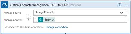 2. Add an Optical Character Recognition (OCR) to JSON action. For this step register here to get the URL and key for “Computer Vision API”. Enter the connection information and after the connection is established, set Image Source to Image Content, and Image Content to the Body of the HTTP trigger.